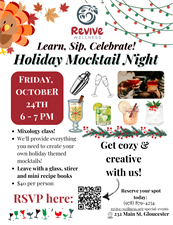Experience a festive evening at our 10/24 Holiday Mocktail Night, where you'll learn to craft delightful non-alcoholic beverages perfect for the season. Enjoy sipping your creations while connecting with others, and leave with a glass, stirrer, and a mini recipe book to continue the celebration at home—all for just $40 per person.